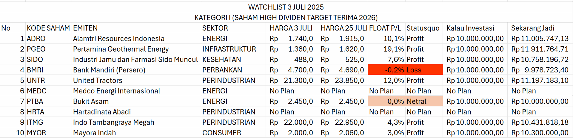 Setelah hampir 1 bulan penuh, watchlist saham yang kita share di course TIC sudah bisa kita lihat perkembangannya bagaimana. Per hari penutupan Jumat, 25 Juli 2025 ada beberapa yang sudah bergerak jauh, ada yang masih jalan ditempat, dan ada salah satu yang turun. Tapi tidak masalah, overall hasilnya masih nampak memuaskan.