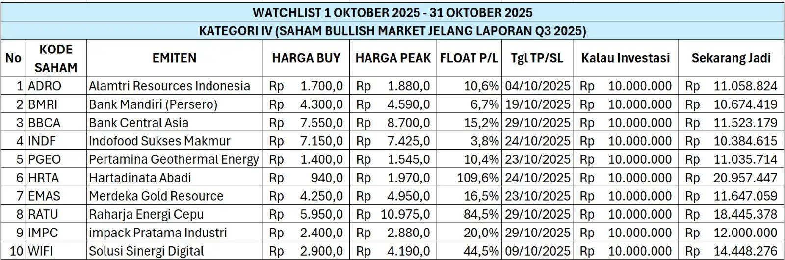 Setelah 1 bulan berjalan, watchlist periode Oktober dibuat pada tanggal 1 Oktober 2025 dan ini dia hasil pergerakan atau kinerja harga dari saham-saham tersebut. Kinerjanya lebih baik dari watchlist sebelumnya, dari 10 saham pilihan 1 diantaranya berhasil cetak bagger ke 109% return dalam sebulan dan lainnya juga untung cukup besar pada bulan ini.